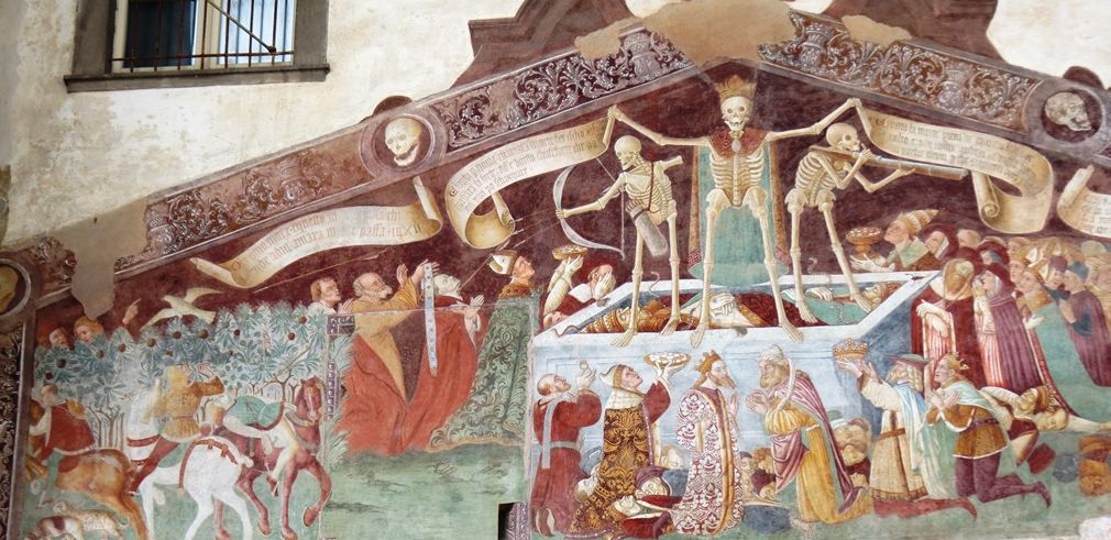 [l'iconografia suggerita, la danza macabra, è stata ritenuta un passaggio fondamentale dopo la peste del 1348 per esorcizzare la morte con un senso di pietà e di ironia tragica per superare il difficile periodo]